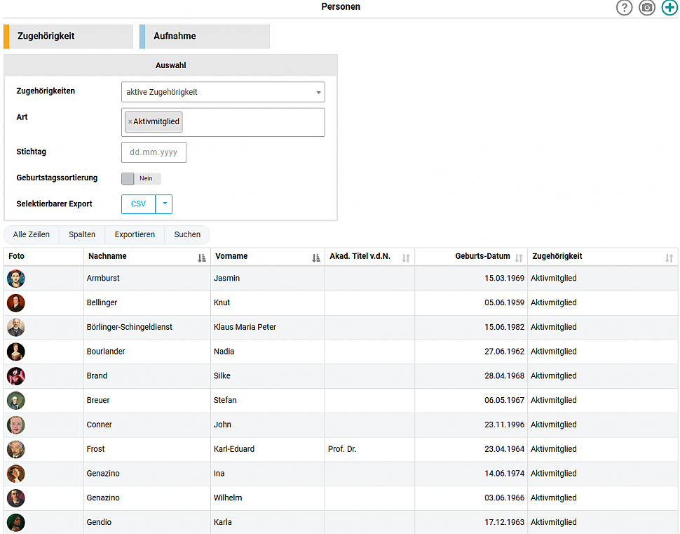 In der Registerkarte Zugehörigkeiten finden Sie alle Personen, die in dem Club angelegt wurden. Das sind alle aktiven Zugehörigkeiten und die ehemaligen Zugehörigkeiten. Die Auswahl, welche Daten angezeigt werden, treffen Sie in dem ersten Listenfeld Zugehörigkeiten.