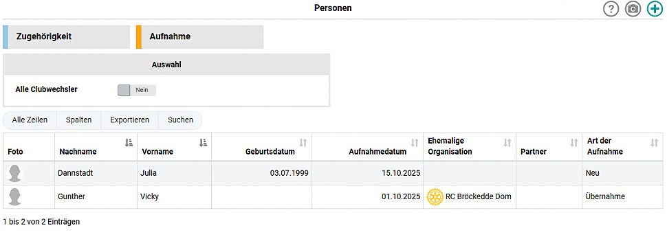 Das System unterscheidet zwei Zustände von Personendaten. Die Personen, welche bereits im Club aufgenommen wurden. Diese finden Sie in der Registerkarte Zugehörigkeit und die Personen, die sich noch im Aufnahmeprozess befinden (Registerkarte Aufnahme).