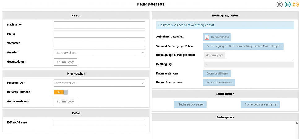 Die vier Personen-Arten sind: Aktivmitglied, Ehrenmitglied, Partner und Sonstige. Je nach Personen-Art sind unterschiedliche Felder Pflichtfelder, das bedeutet, dass unterschiedliche Felder gefüllt werden müssen, um die Person in den Club aufzunehmen.
