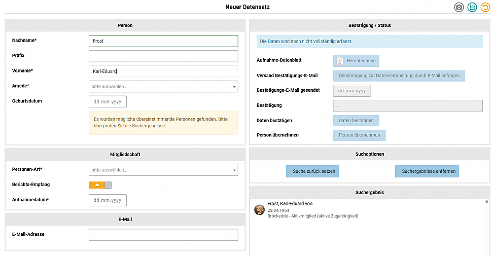 Die folgende Abbildung zeigt die Reaktion des Programms, wenn dies der Fall ist. Dann ist es ausreichend, auf die Person im Bereich Übereinstimmung zu klicken, um die Personendaten in den Club zu übernehmen.