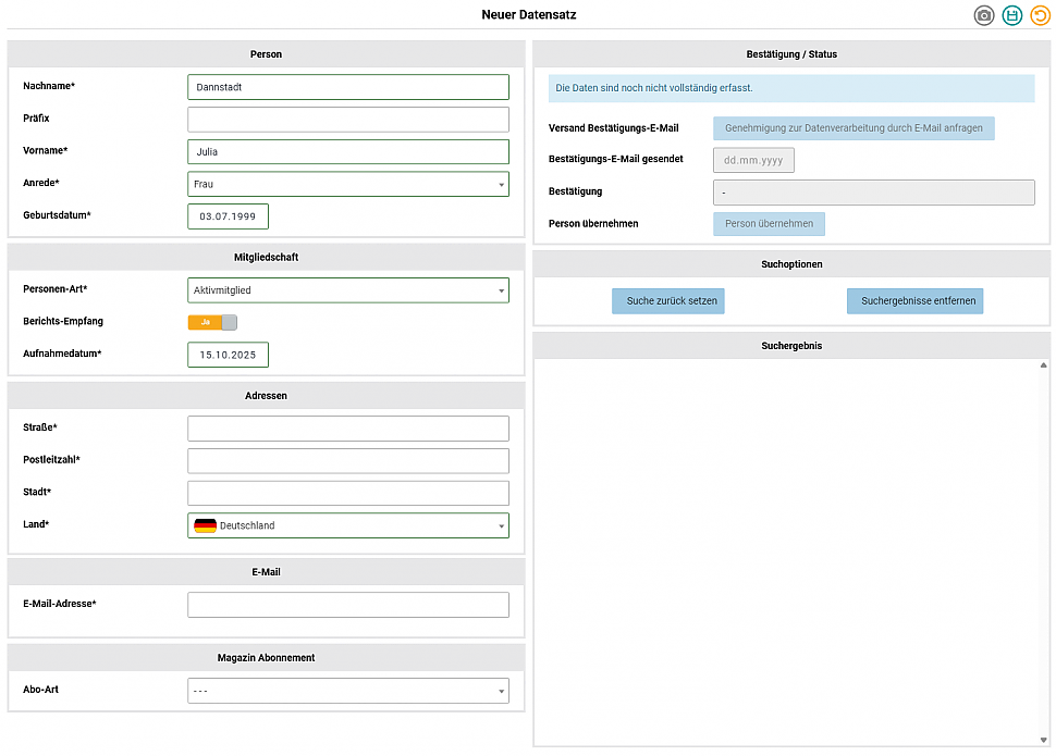 Abbildung 3: Erfassung eines Aktivmitglieds mit Basisdaten