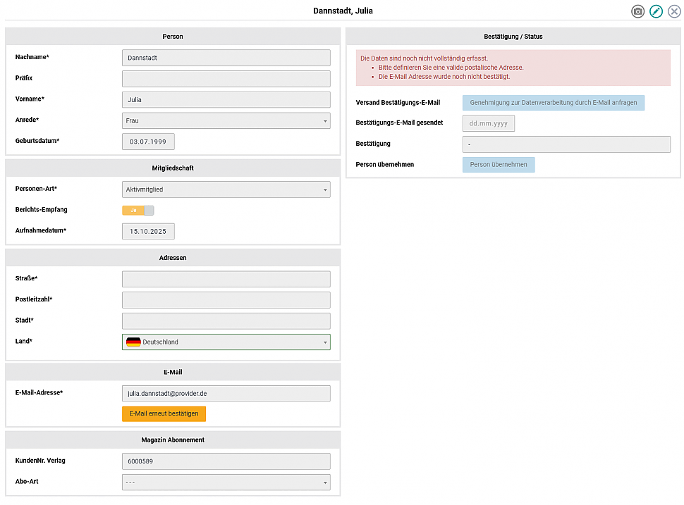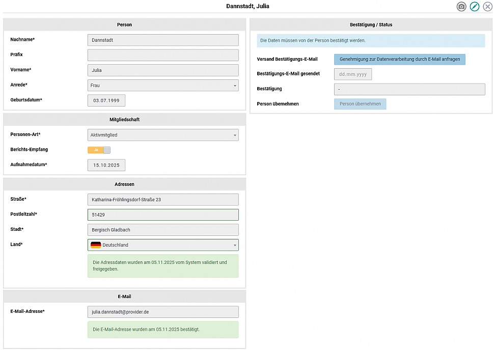 Die E-Mail-Adresse wurde validiert, die Postanschrift wurde validiert und freigegeben, die Genehmigung zur Verarbeitung der persönlichen Daten wurde durch die Person erteilt.