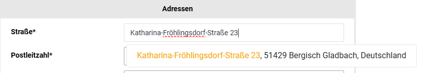 Mit der Eingabe des Straßennamens wird nach Übereinstimmungen des Straßennamens* gesucht und als Ergebnis vorgeschlagen. Wird die richtige Anschrift gefunden, dann klicken Sie auf das korrekte Ergebnis.