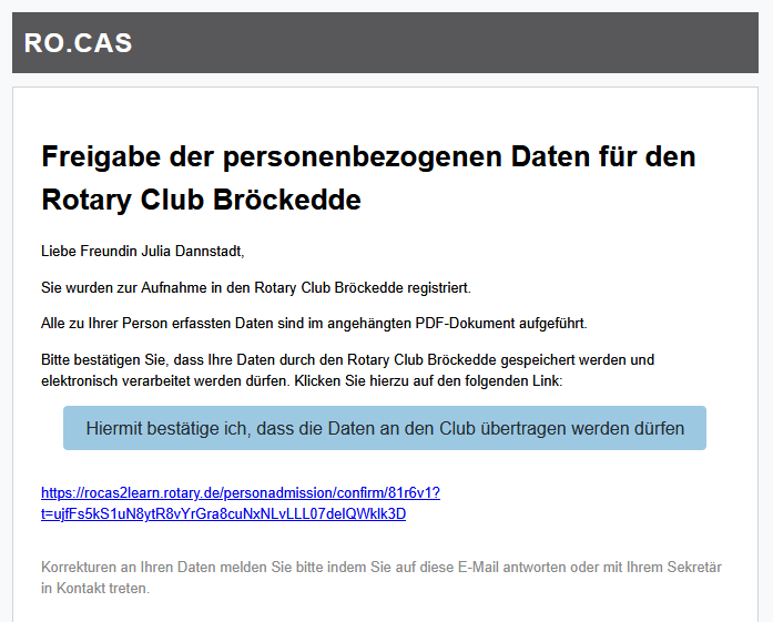 Mit der Anfrage um Genehmigung wird der Person ein Datenblatt zugesendet, welches die Daten der Person im System enthält. Damit kann die Person also prüfen, welche Daten über ihn gespeichert werden.