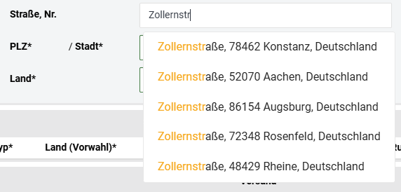 In dem Beispiel geben wir einen Straßennamen in das Feld Straße ein. Mit der Eingabe sucht das Programm in der Datenbank nach Übereinstimmungen und zeigt diese an. Sie haben nun die Möglichkeit, mit der Maus eine Auswahl zu treffen oder weiterzuschreiben.