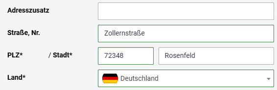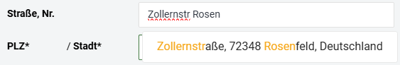 In dem vorliegenden Fall können Sie direkt auf die Zeile 72348 Rosenfeld klicken. Das Programm übernimmt jetzt die ausgewählte Adresse. Sie müssen nur noch die Hausnummer ergänzen.