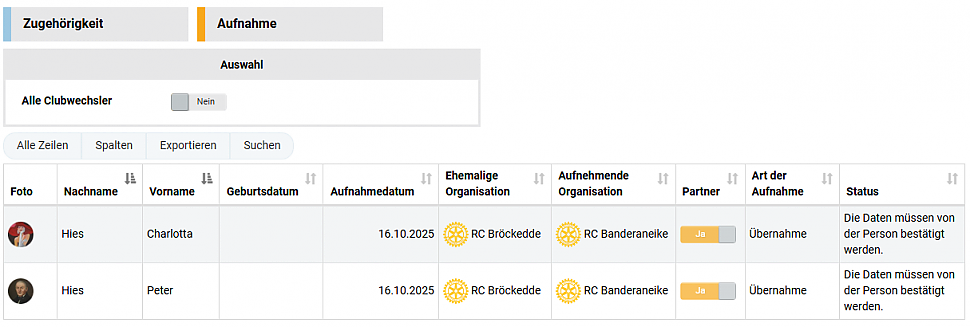 In der Spalte Partner können Sie erkennen, dass es sich um ein Paar handelt, welches in den Club aufgenommen werden soll, wenn man mal von den Nachnamen absieht.