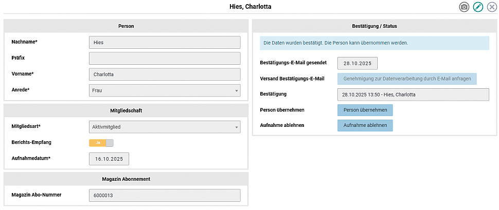 Sobald der Aufnahmekandidat der Verarbeitung seiner Daten zugestimmt hat, wird das in der Maske angezeigt und der Knopf für die eigentliche Übernahme wird freigegeben.